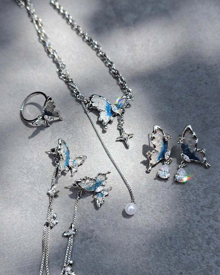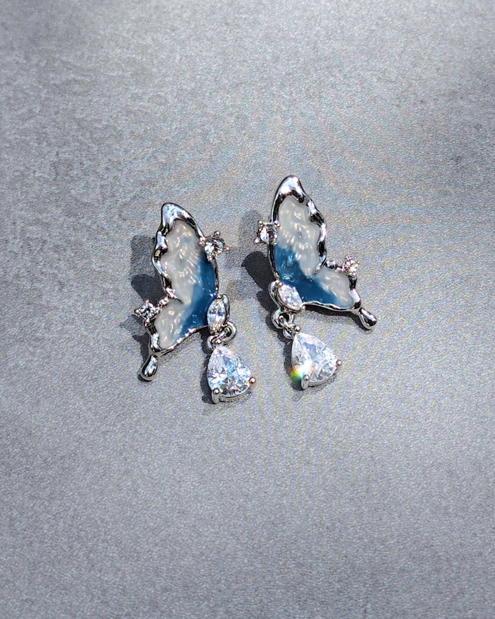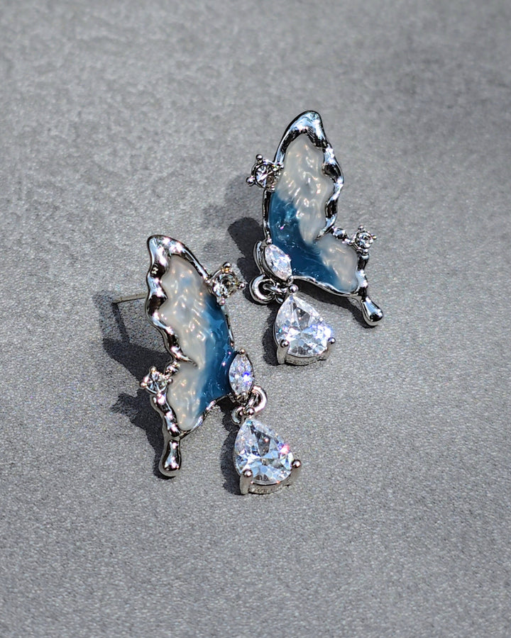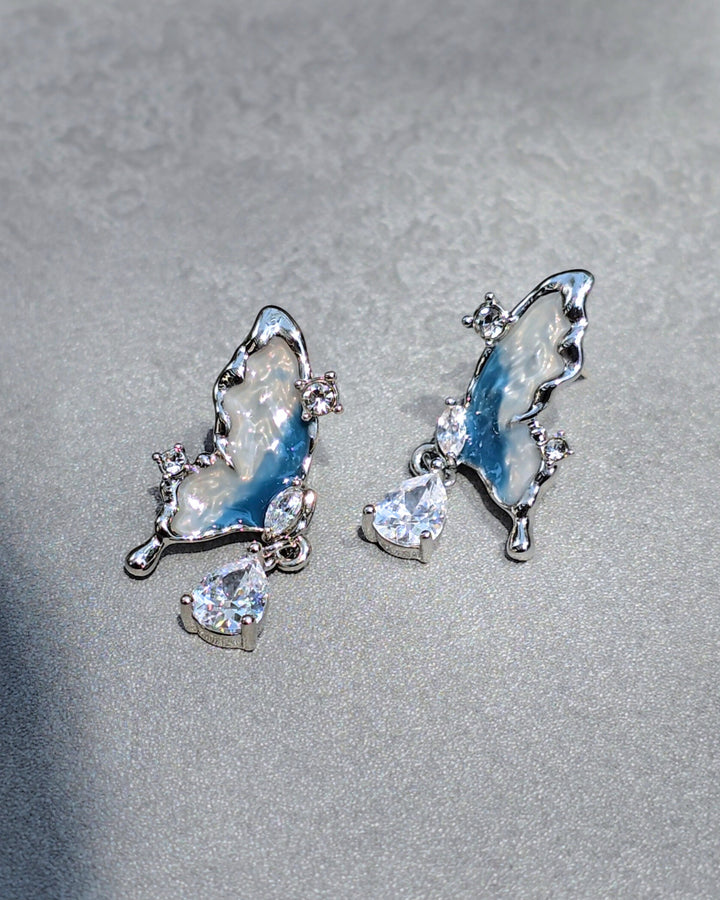 Silver butterfly earrings with zirconia and wings in cool blue and white tones, resembling the colors of a glacier.