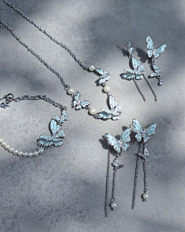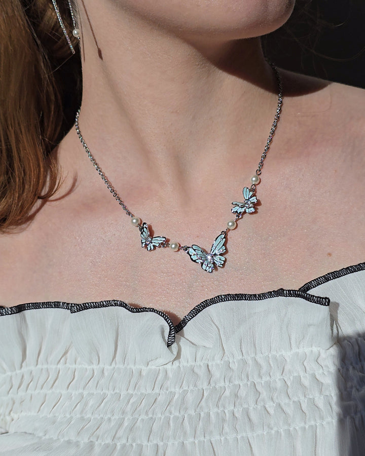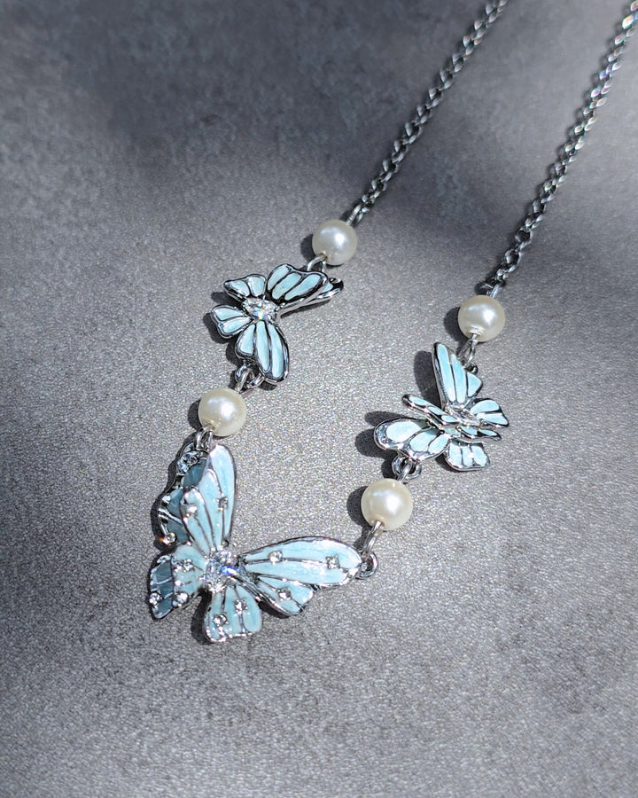 Silver chain necklace adorned with blue butterflies, pearl accents and shimmering gemstones. Their wings are sprinkled with tiny crystals that glisten like dewdrops.